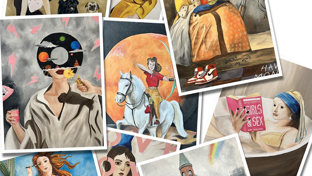 En esta exposición, la figura femenina adquiere un papel central, donde combina elementos clásicos con detalles contemporáneos y un sello personal que caracteriza cada obra. Sus cuadros incorporan siempre guiños íntimos —una frase, un icono o un símbolo significativo— que aportan un valor único y una narrativa propia a cada pieza.